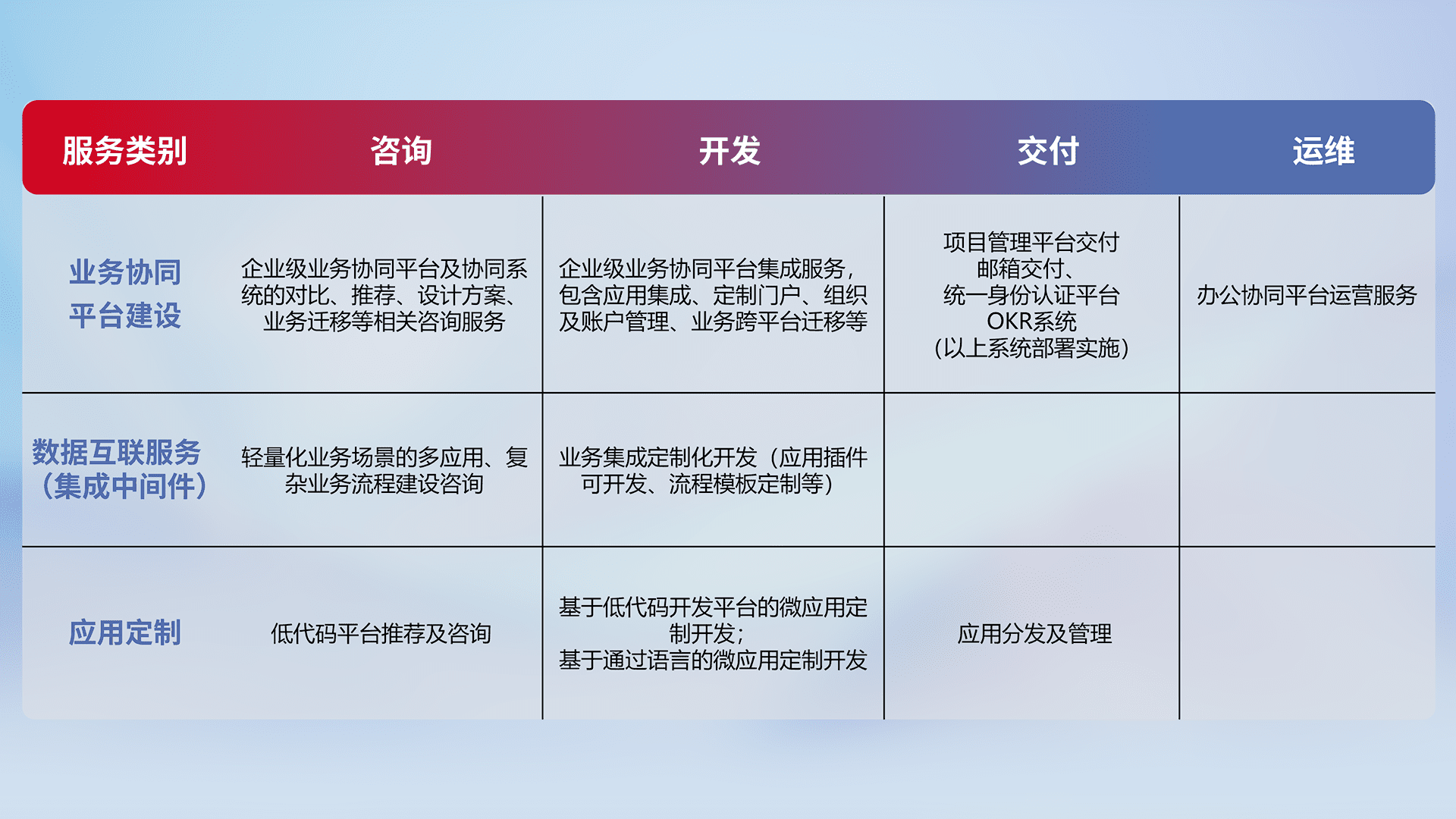 针对钉钉、、企微、、、、IDaas等平台级产品提供产品的规划、、、方案、、、、交付、、定制化开发等服务,,实现如统一协同办公、、智能客户服务、、混合会议管理、、、智能数据查询、、等业务场景,,,,实现数字化转型。。